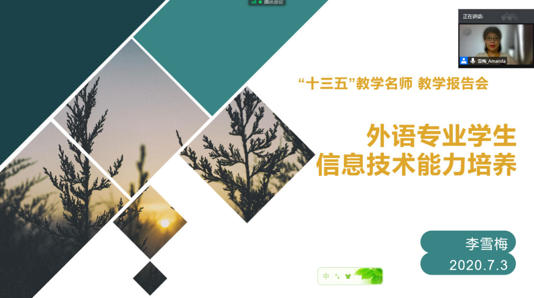 2020年7月3日,依托“腾讯会议”平台,外国语学院教师、学校“十三五”教学名师李雪梅为英、日语专业青年教师进行了一场教育教学报告。该报告主要基于《外国语言文学类教学质量国家标准》和《外国语言文学类专业教学指南》中对学生信息技术能力的相关要求,剖析了当前外语专业学生信息技术能力现状,梳理了相关研究,结合我院实际,从教学目标、教学内容、教学方法、教学手段、教学评价等五个方面探讨了信息技术能力培养模式的构建,并从教师发展的角度对学院师资培养提出了建议。