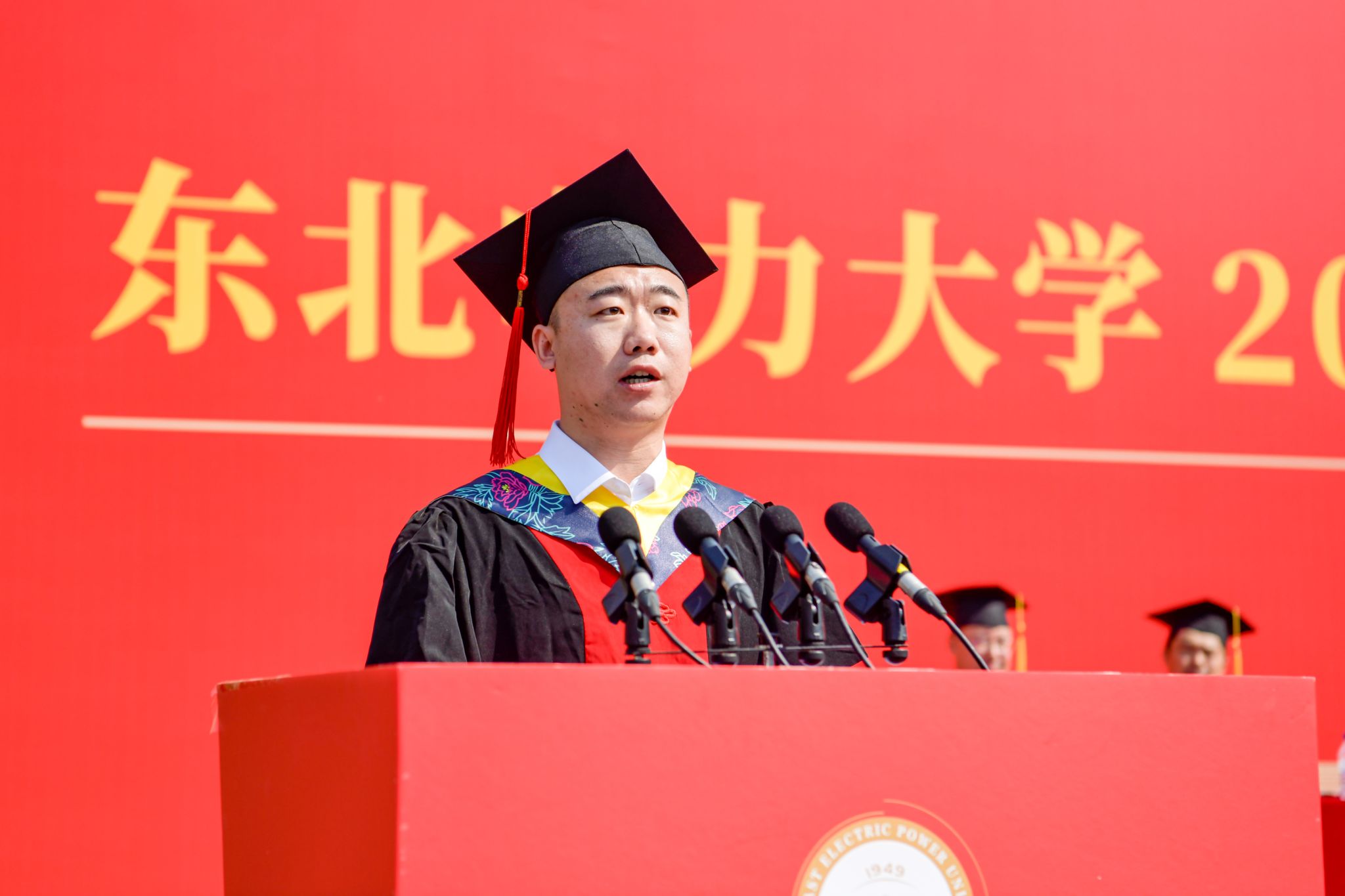 在校生代表,国家奖学金、吉林省政府奖学金获得者建筑工程学院土木212班郭海宇在发言中回顾大学3年来学长学姐对他的帮助,表达对毕业生的感谢,他说将以学长学姐为榜样,努力奋斗,传承东电精神,为强国建设作出贡献,最后向学长学姐表达了诚挚的祝福。