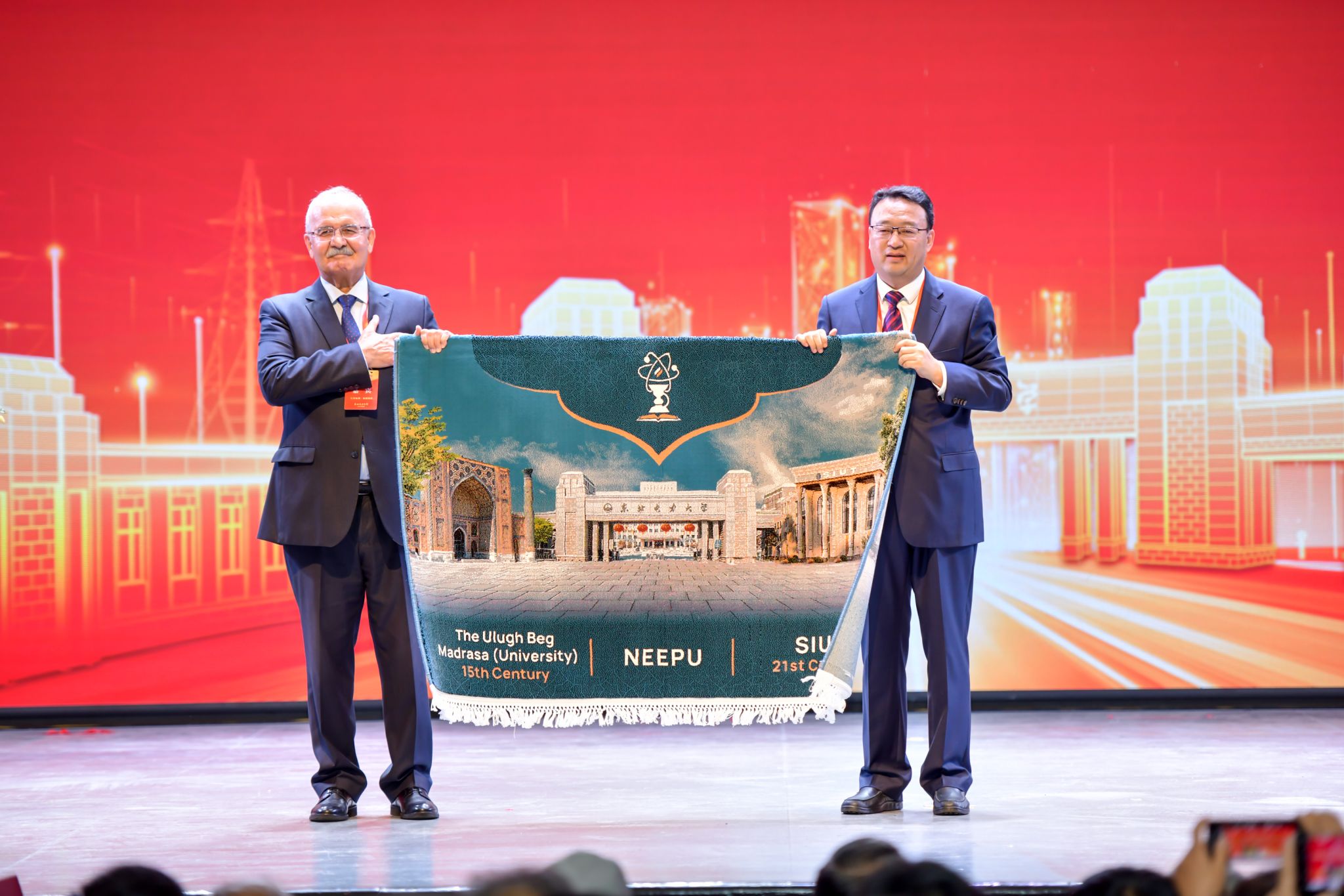 合作高校代表,与学校共建“中国电力学院”的乌兹别克斯坦共和国撒马尔罕国际工业大学校长阿卜杜拉耶夫作合作发展报告。报告结束后,阿卜杜拉耶夫代表撒马尔罕国际工业大学校向我校赠送礼物。