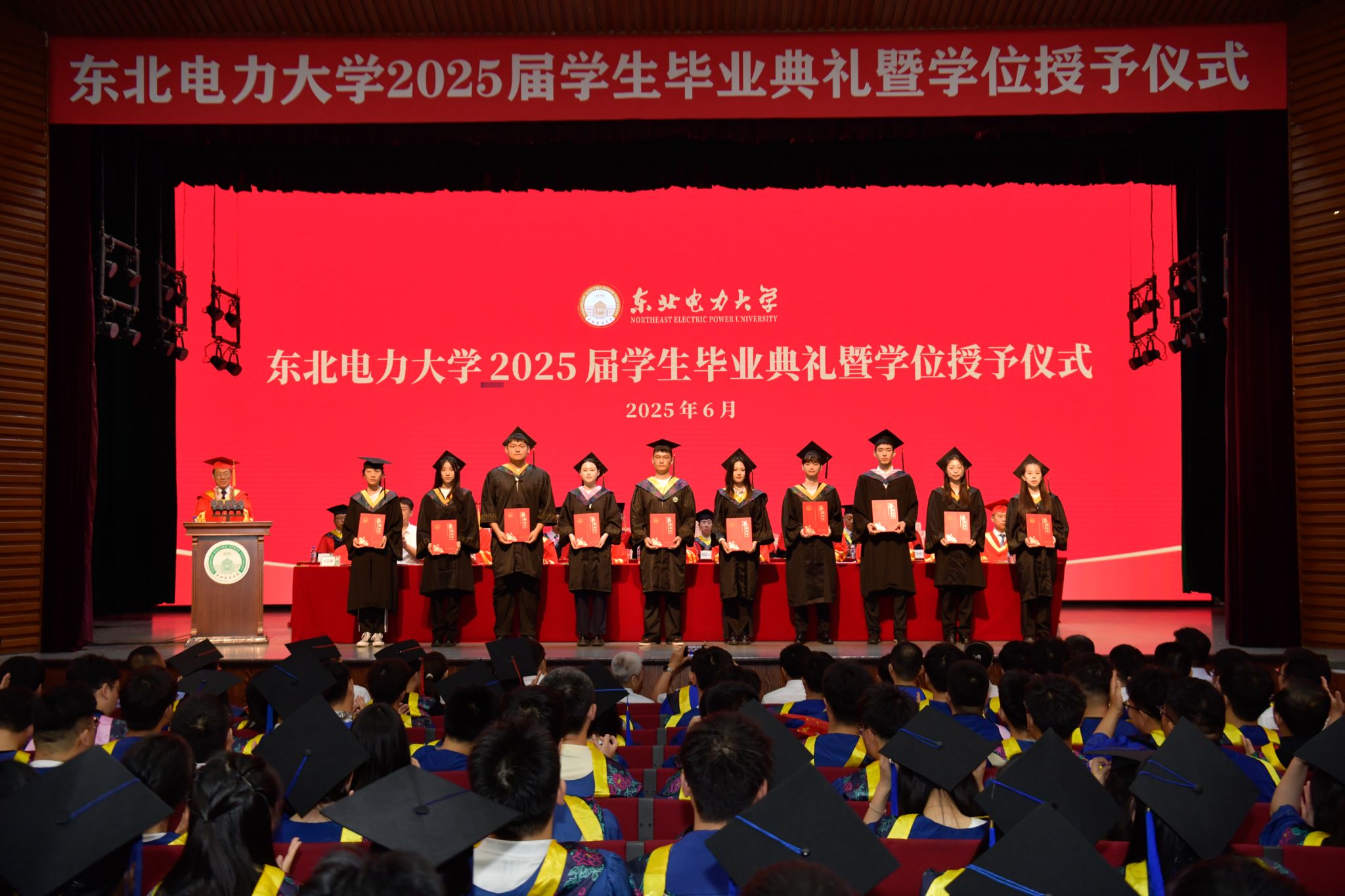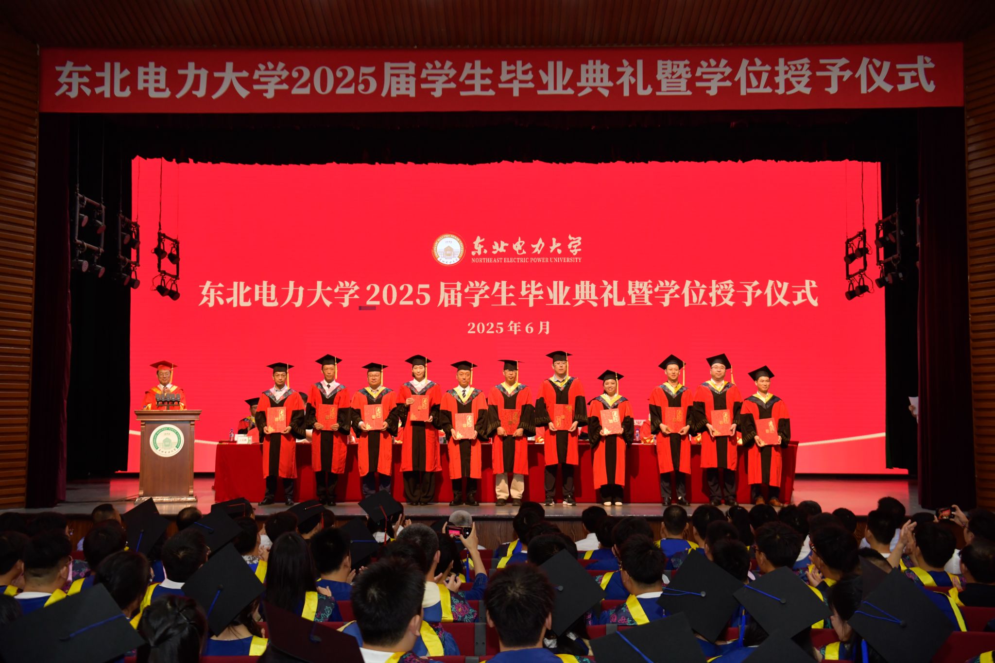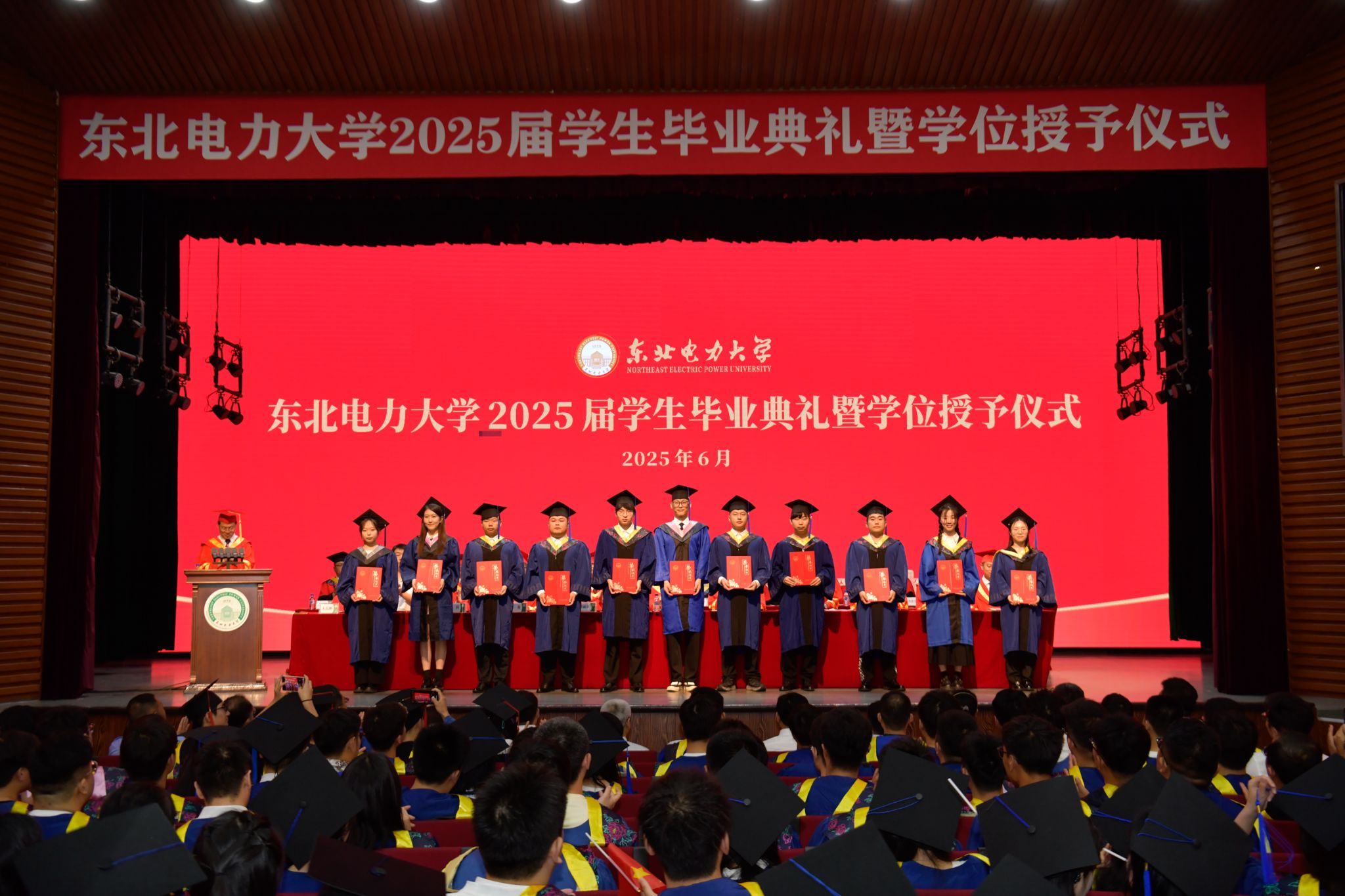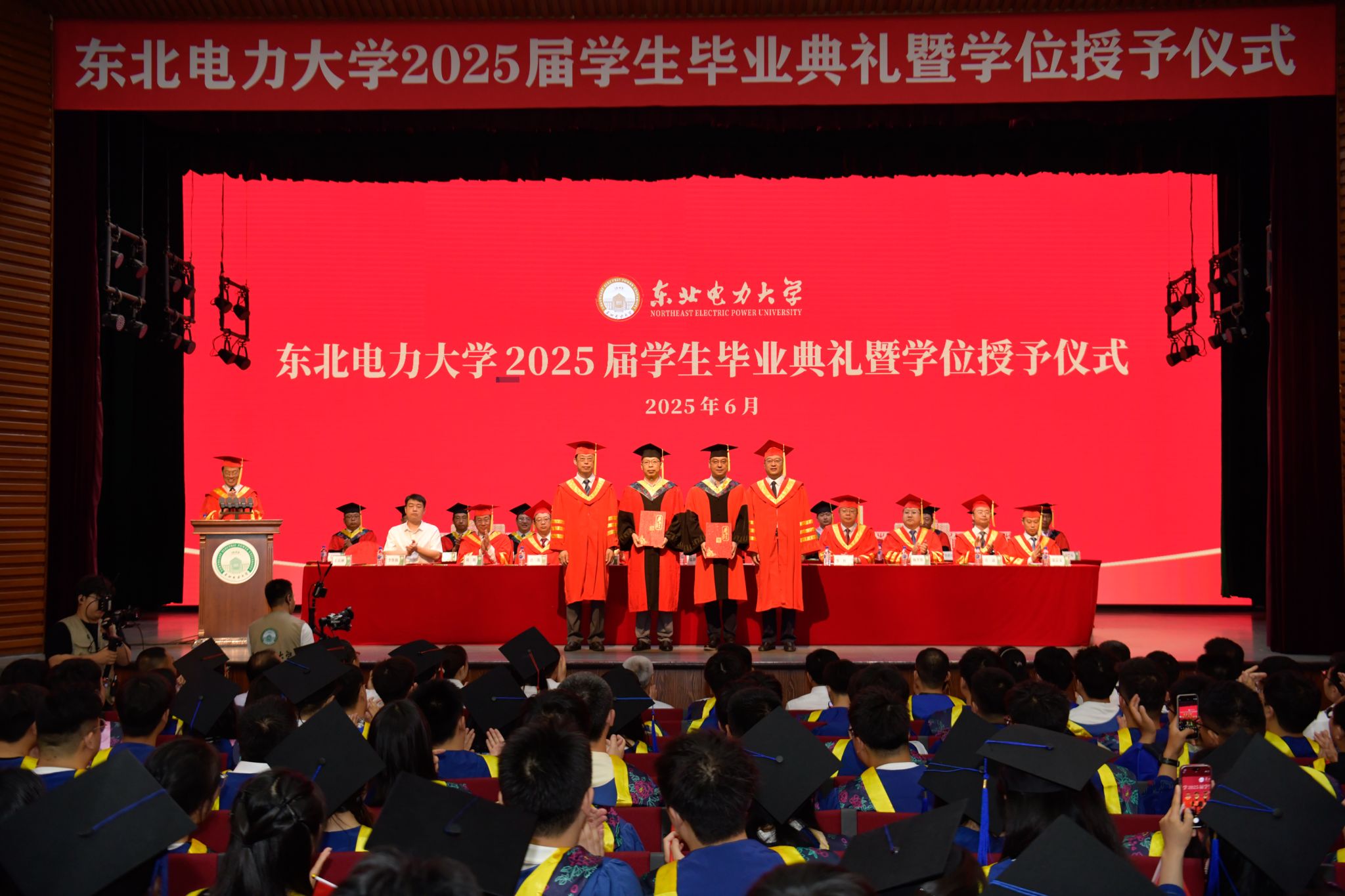 6月28日上午,东北电力大学2025届学生毕业典礼暨学位授予仪式在石头楼礼堂举行。学校党委书记张静辉出席,校长蔡国伟寄语全体毕业生。学校领导、各教学单位、有关职能部门负责人,校友和学生家长代表参加典礼,党委常委、副校长王庆洲主持,典礼在全场齐唱国歌声中拉开序幕。