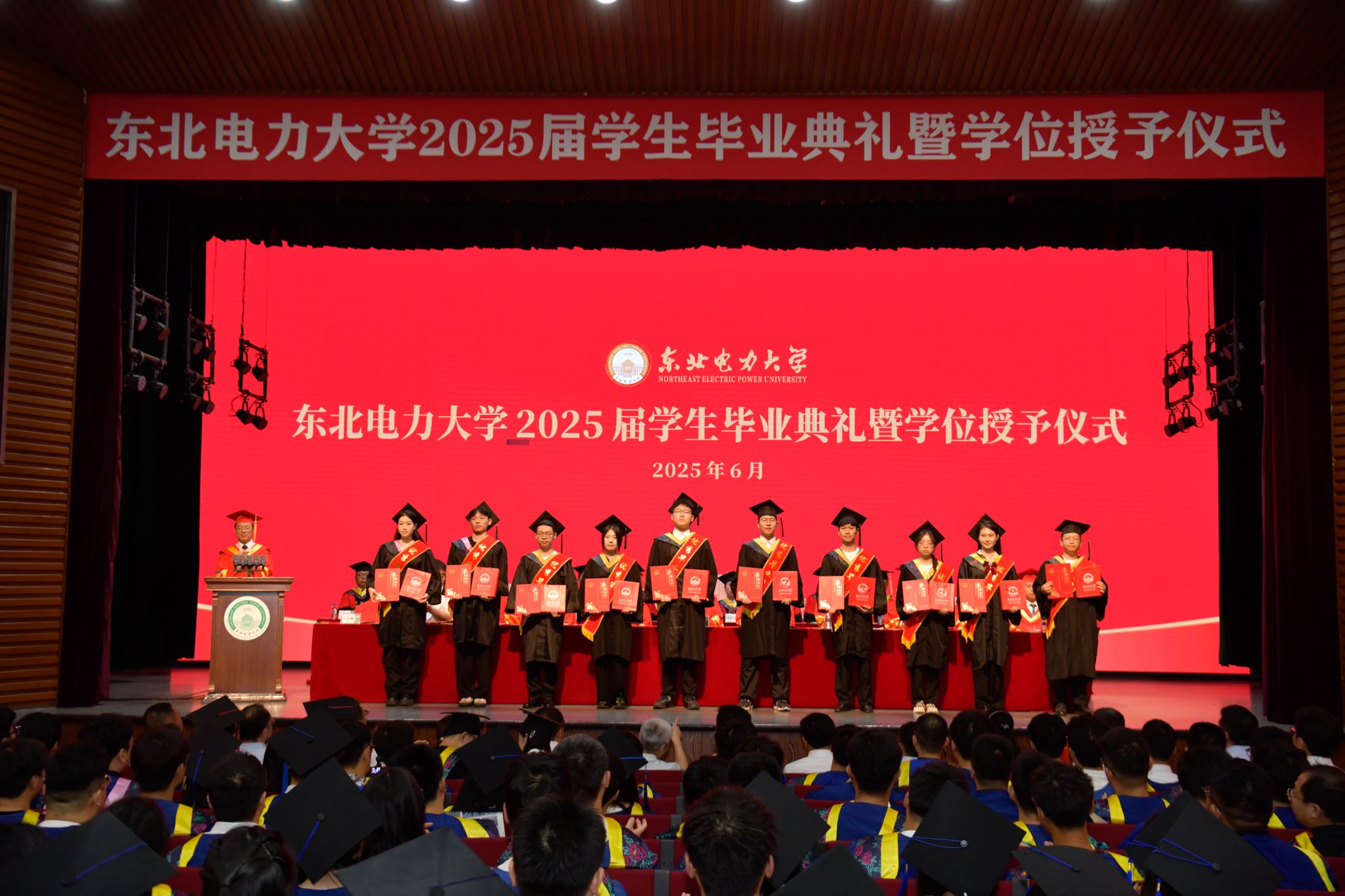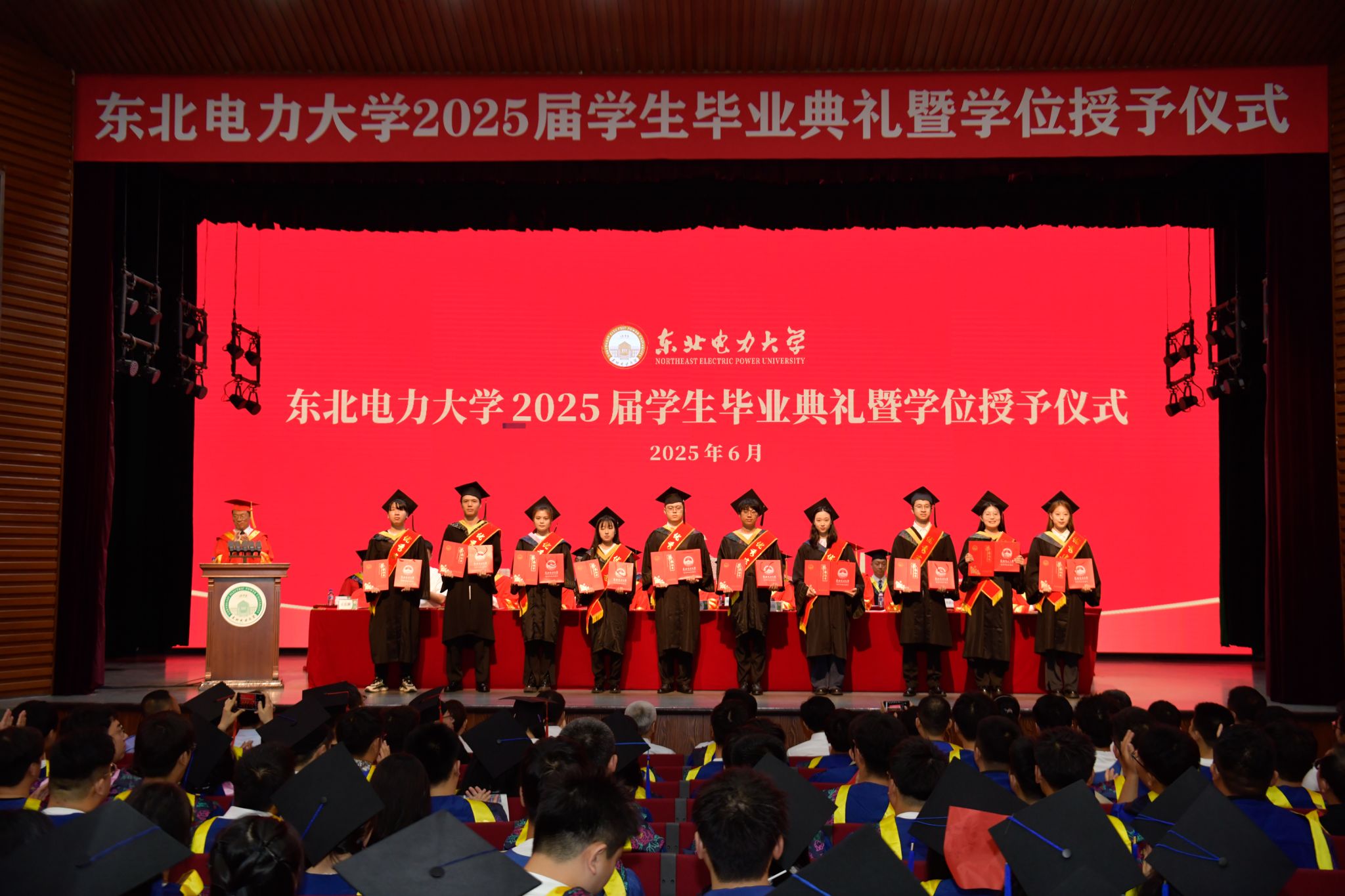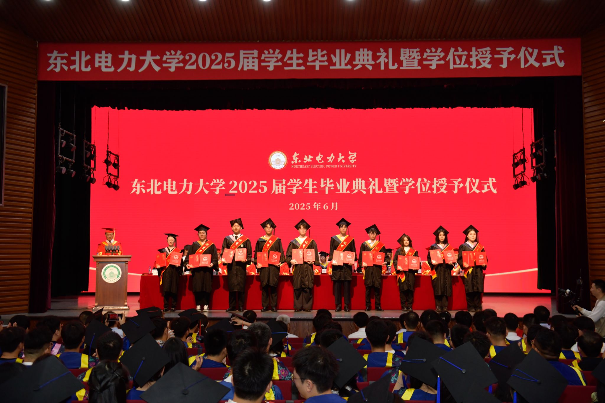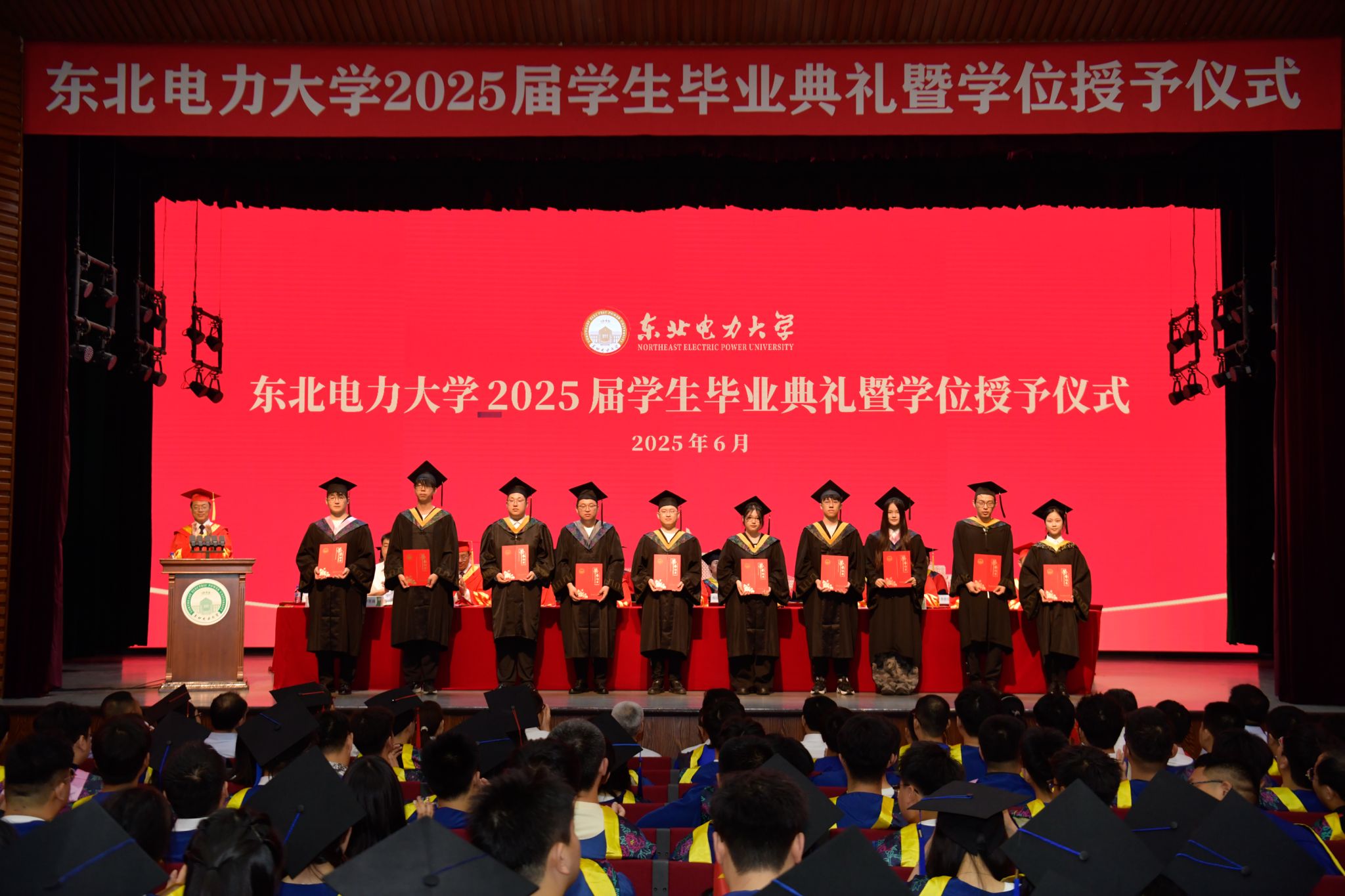 6月28日上午,东北电力大学2025届学生毕业典礼暨学位授予仪式在石头楼礼堂举行。学校党委书记张静辉出席,校长蔡国伟寄语全体毕业生。学校领导、各教学单位、有关职能部门负责人,校友和学生家长代表参加典礼,党委常委、副校长王庆洲主持,典礼在全场齐唱国歌声中拉开序幕。