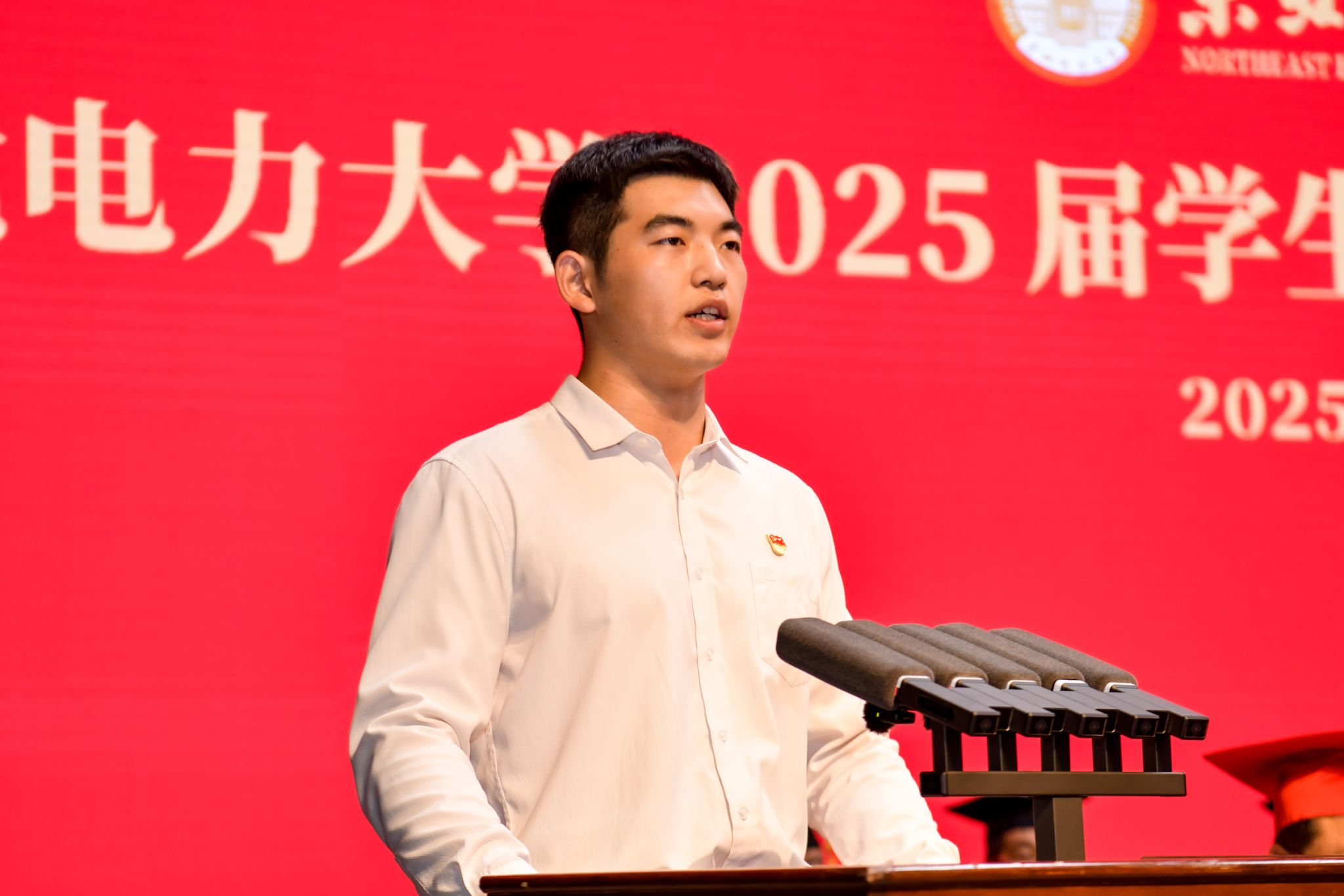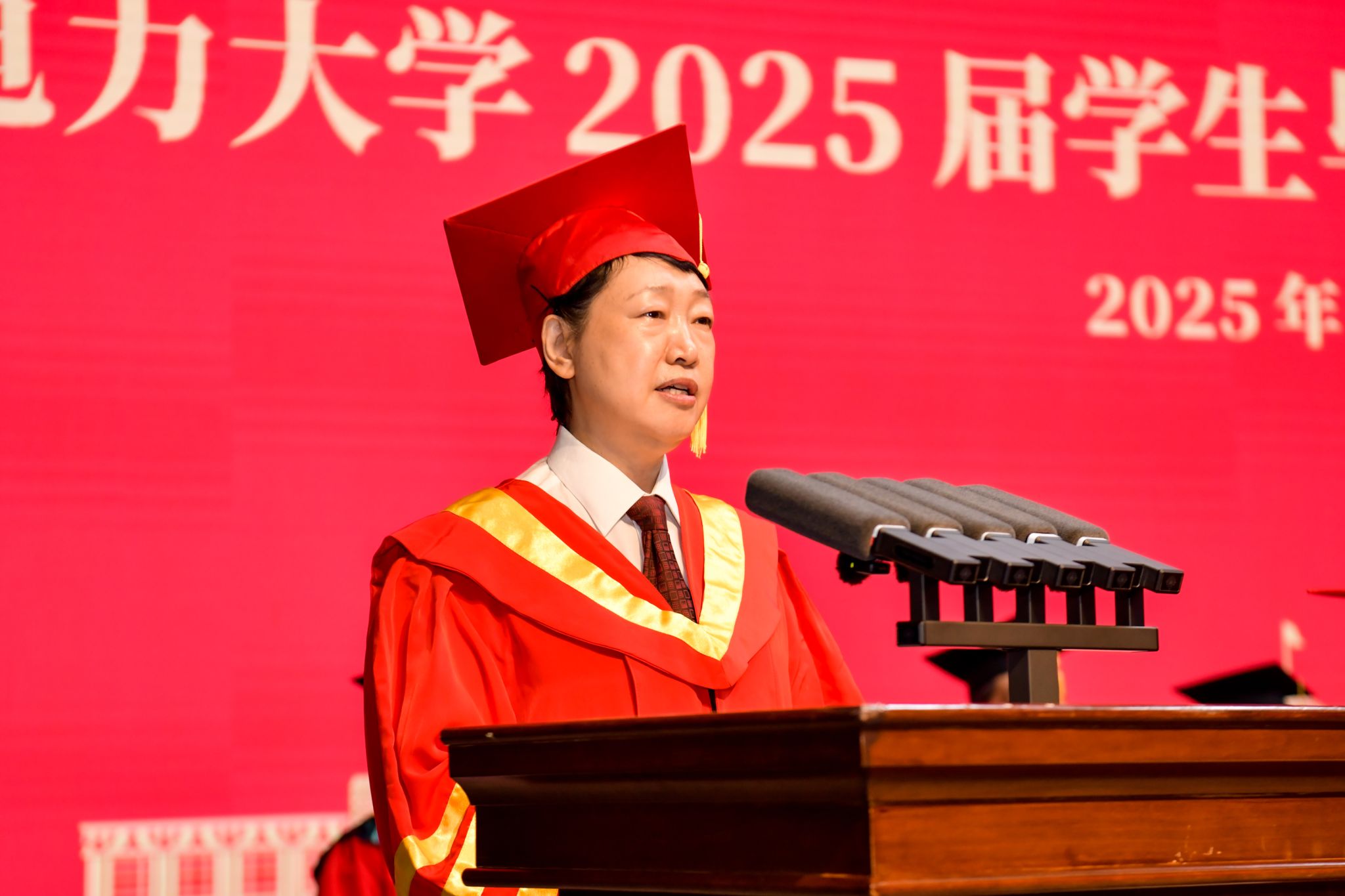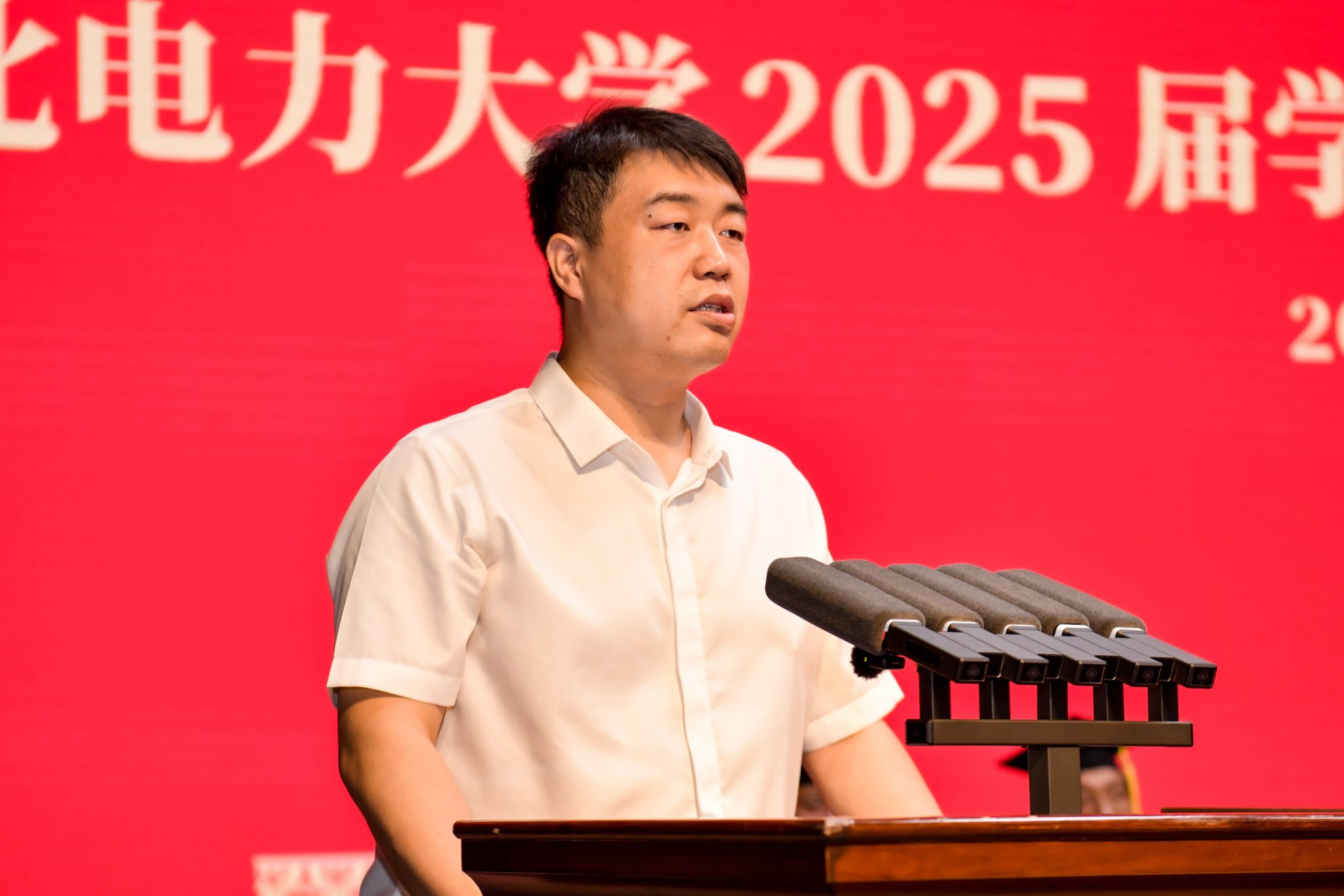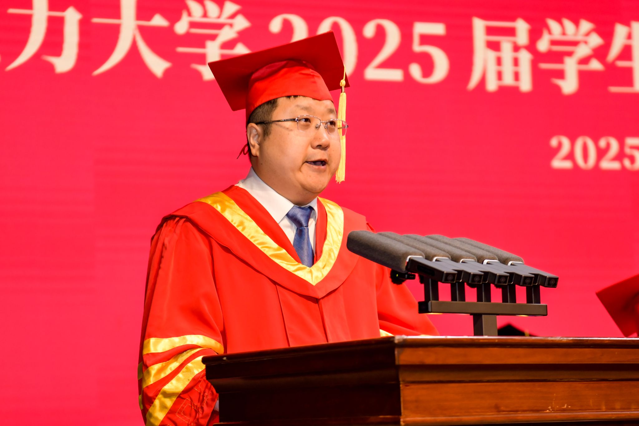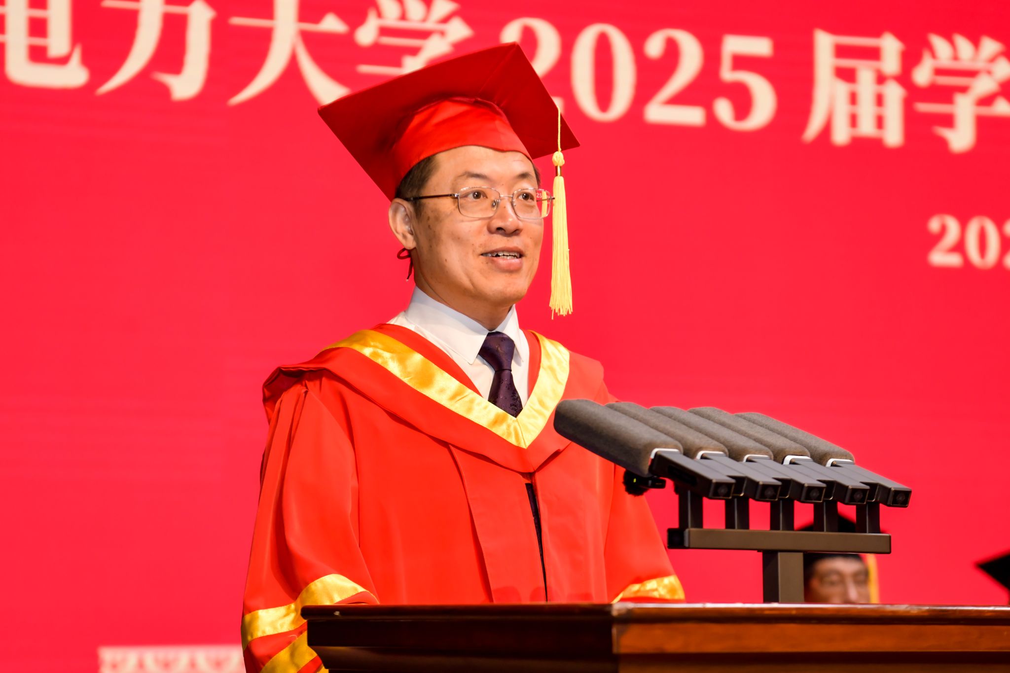 蔡国伟代表学校,向圆满完成学业的6111名毕业生表示热烈的祝贺,回顾了2025届毕业生在校学习生活的青葱岁月,同学们挥洒青春汗水书写了这一代东电学子浓墨重彩的绚丽篇章,让“讲忠诚、讲团结、讲感恩,有扎实学识、有踏实作风”的人才培养特色薪火相传。蔡国伟就如何“站稳祖国人民立场、迎接时代变革挑战、勇敢扛起大变局中当代青年的使命与责任”,提出三点建议与同学们共勉。一是站稳祖国人民立场,听懂历史回响,看清前行方向。希望同学们以全局视野观大势,以历史自觉明方向,在洞察复杂变迁中校准人生坐标,在民族复兴征程中彰显责任担当。二是迎接时代变革挑战,培树开阔胸襟,筑牢奋进根基。希望同学们在人工智能时代让自己在信息茧房与流量焦虑中找到纾解的方向与奋进的动力,把开阔的胸襟、积极的心态、应变的勇气变成自己最为坚实的铠甲。三是扛起青年使命责任,练就过硬本领,展现担当气魄。希望同学们要弘扬东电人“驭能者”的远见卓识,筑牢东电人“点灯人”的价值厚度,成为奉献祖国、奋进时代的最强力量。