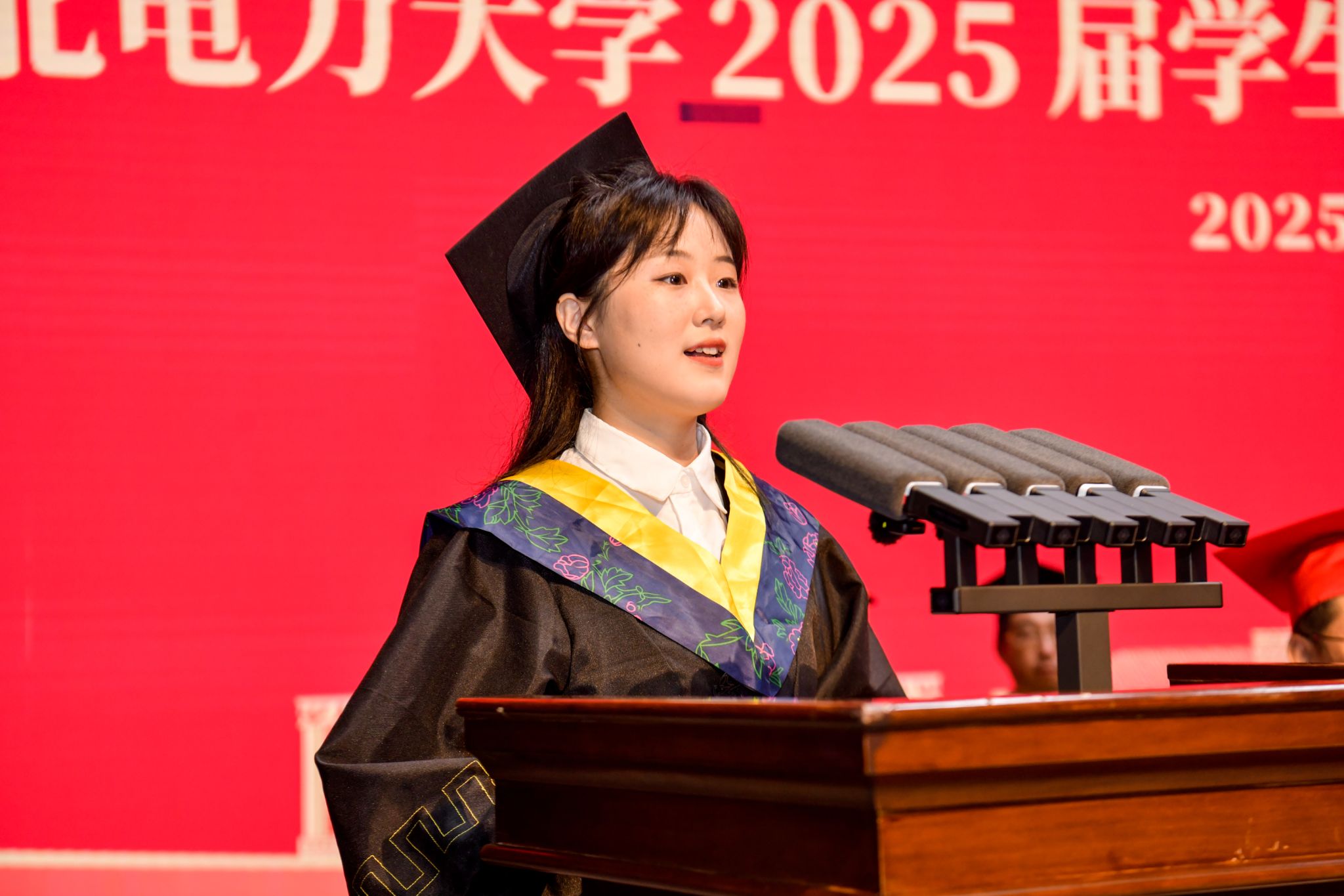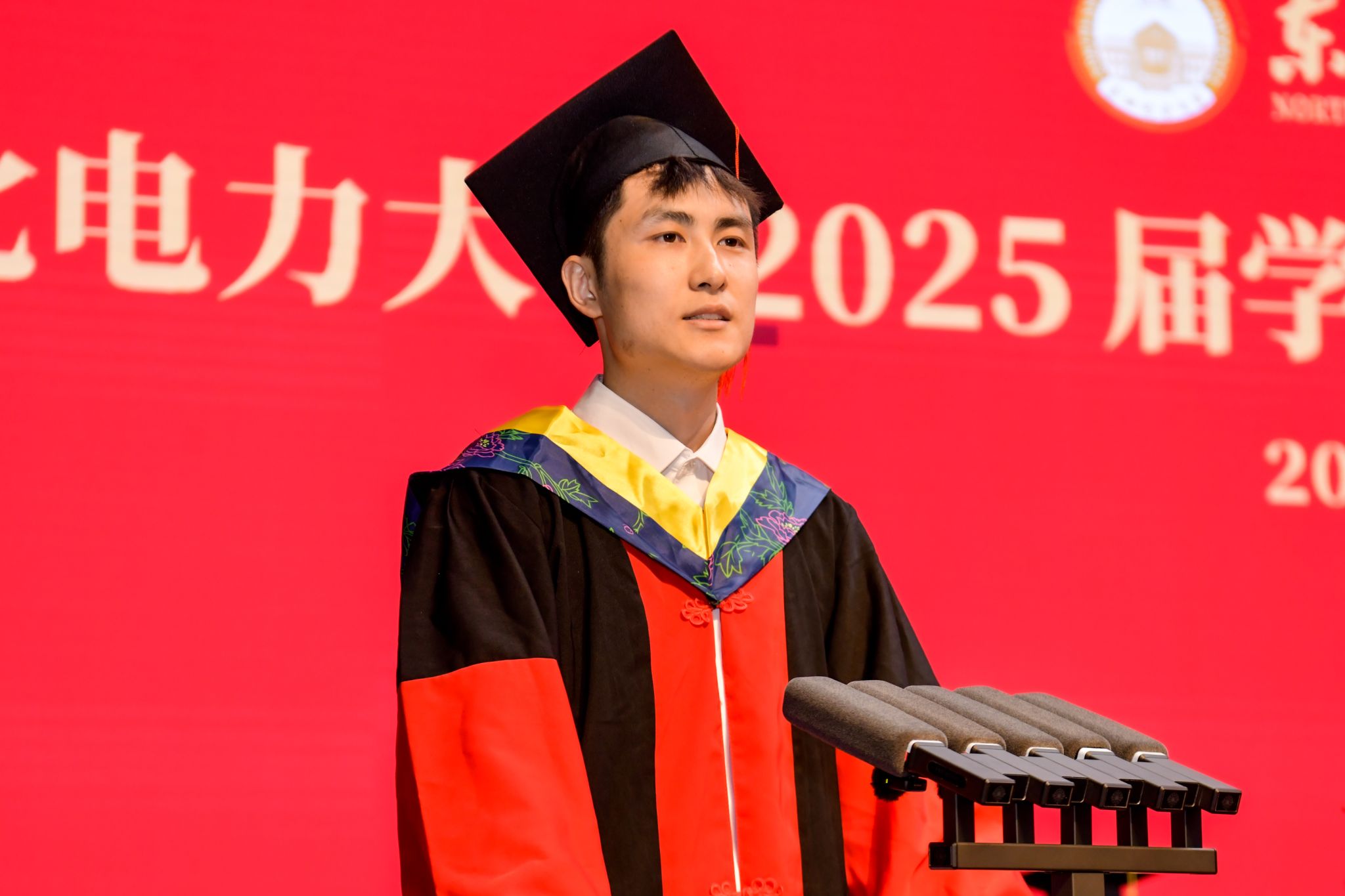 毕业研究生代表,优秀博士学位论文获得者,自动化工程学院控制科学与工程2022级博士研究生夏秀鑫同学;本专科毕业生代表,现已签约至国网西藏电力建设有限公司的电气工程学院电自2119班郭悦同学先后发言。他们在发言中以校训精神为脉络,回顾成长,展望未来,并表示将以强国有我作为使命担当,用青春书写属于东电人的壮丽篇章!