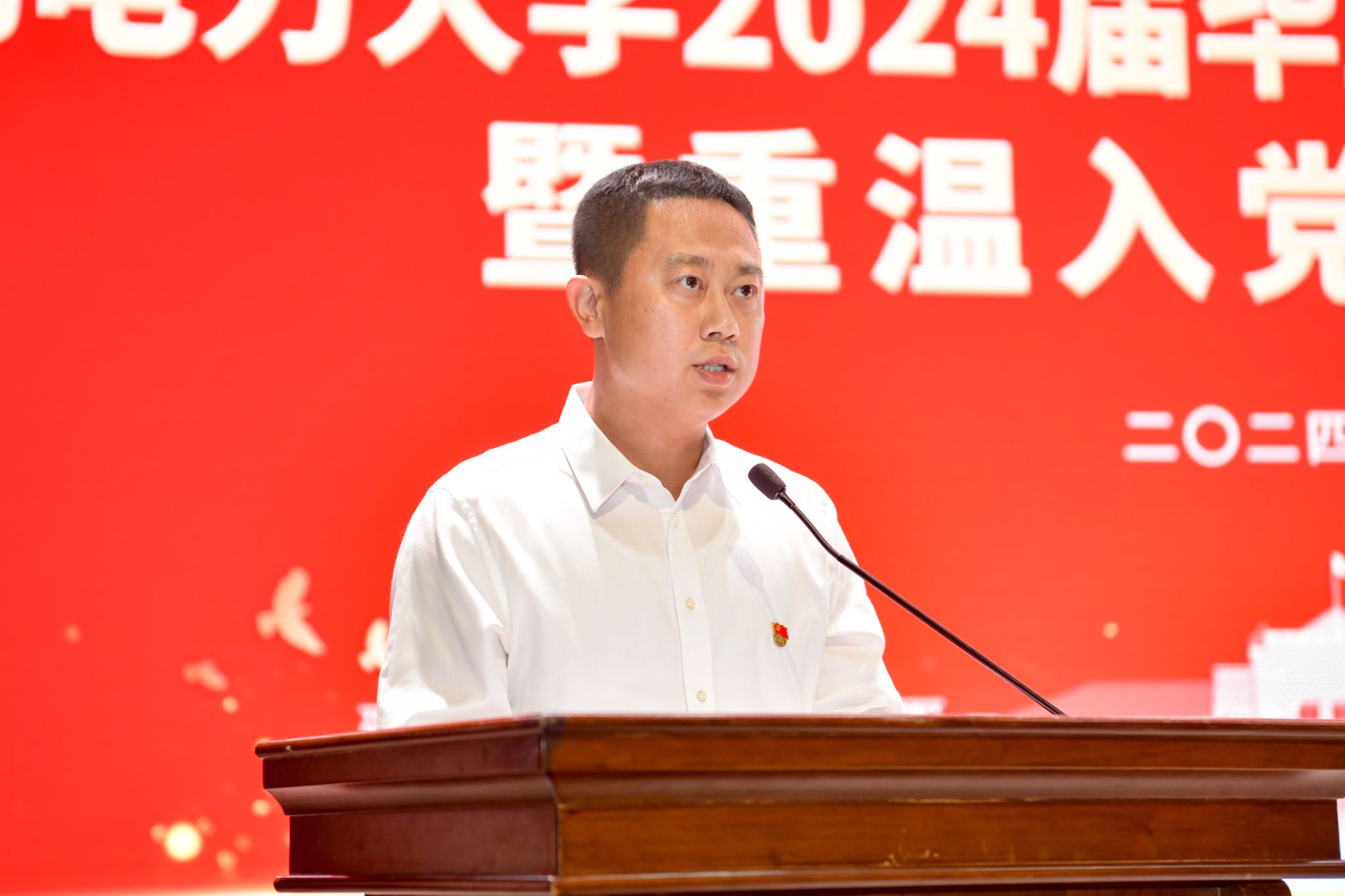 6月23日,学校2024届毕业生党员毕业前最后一次党课暨重温入党誓词仪式在石头楼礼堂举行。学校优秀党员校友、电气工程及其自动化专业2007届毕业生常青松回到母校为毕业生党员讲授党课。学校党委常委、组织部部长、党校副校长张志文参加活动。