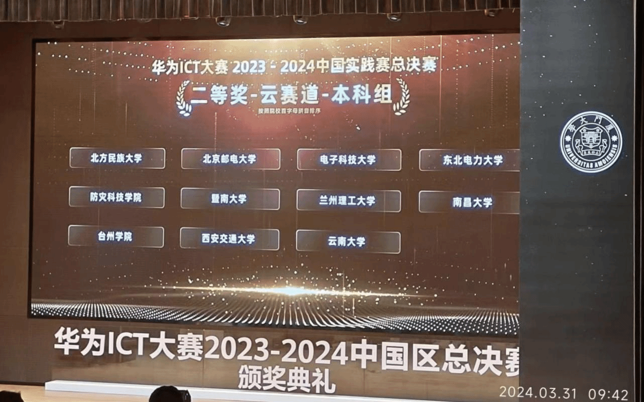 2024年3月30日-31日,华为ICT大赛2023-2024中国总决赛暨颁奖典礼在福建厦门圆满落幕。我校计算机学院娄建楼指导的参赛队荣获中国区实践赛(云赛道)总决赛全国二等奖。