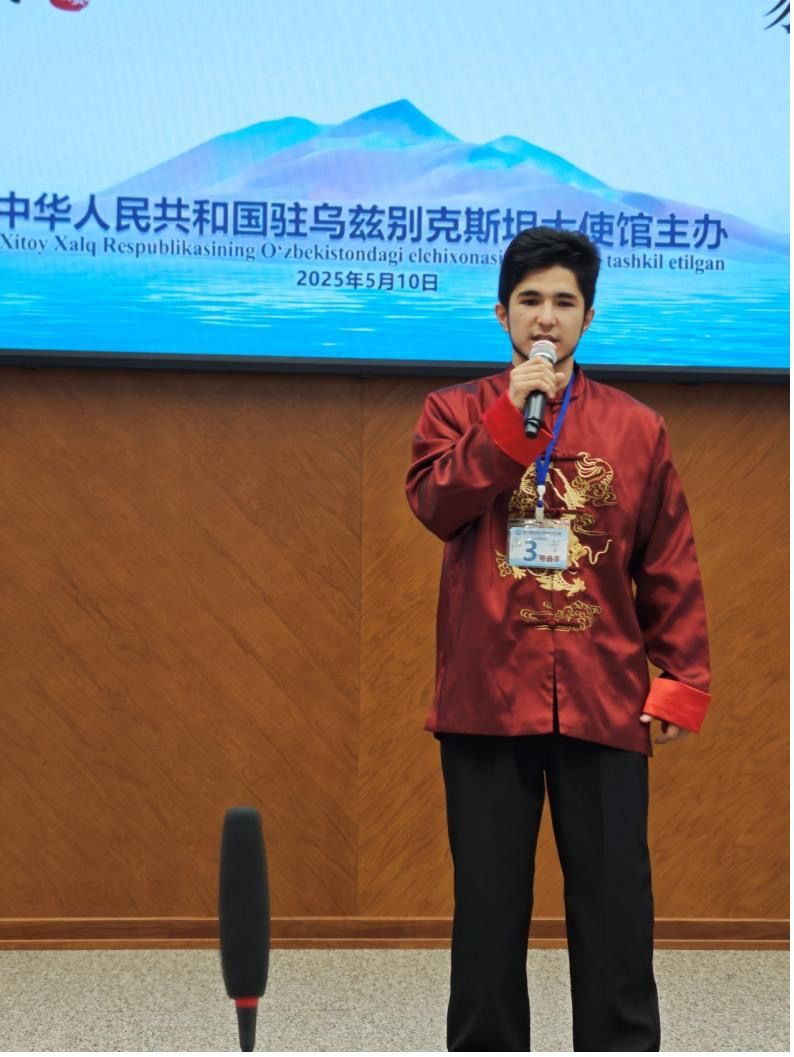 今年,中国驻乌兹别克斯坦大使馆在塔什干和撒马尔罕两个地区成功举办了预赛。在预赛中,来自中国电力学院一年级的学生邱易禾荣获撒马尔罕赛区第三名,获得前往塔什干参加乌兹别克斯坦赛区决赛资格。决赛包括个人演讲、知识问答和看图说话、才艺表演三个环节,10位选手的表现各具特色,令人印象深刻。中国电力学院派出的选手邱易禾(Sayfiyev Shoxrux),在才艺表演环节中荣获满分,最终荣获第九名。
