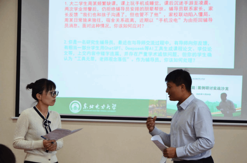 11月20日,我校小石头辅导员工作室在电动大楼A416举办“研赛赋能——案例研讨实战沙龙”活动。本次沙龙邀请了黑龙江大学于洋(教育部“宏志助航计划”培训专家、全国高校辅导员名师工作室主持人、2024年“龙江最美高校辅导员”),黑龙江中医药大学杨玉赫(全国高校辅导员名师工作室主持人、2022年“龙江最美高校辅导员”),能源与动力工程学院党委书记李金韦,党委学生工作部副部长、学生处副处长佟金梅,输变电技术学院党委副书记马立明等具备学生工作及赛事指导经验的5位嘉宾。全校20余名辅导员参加本次沙龙,活动由工作室负责人田畅主持。